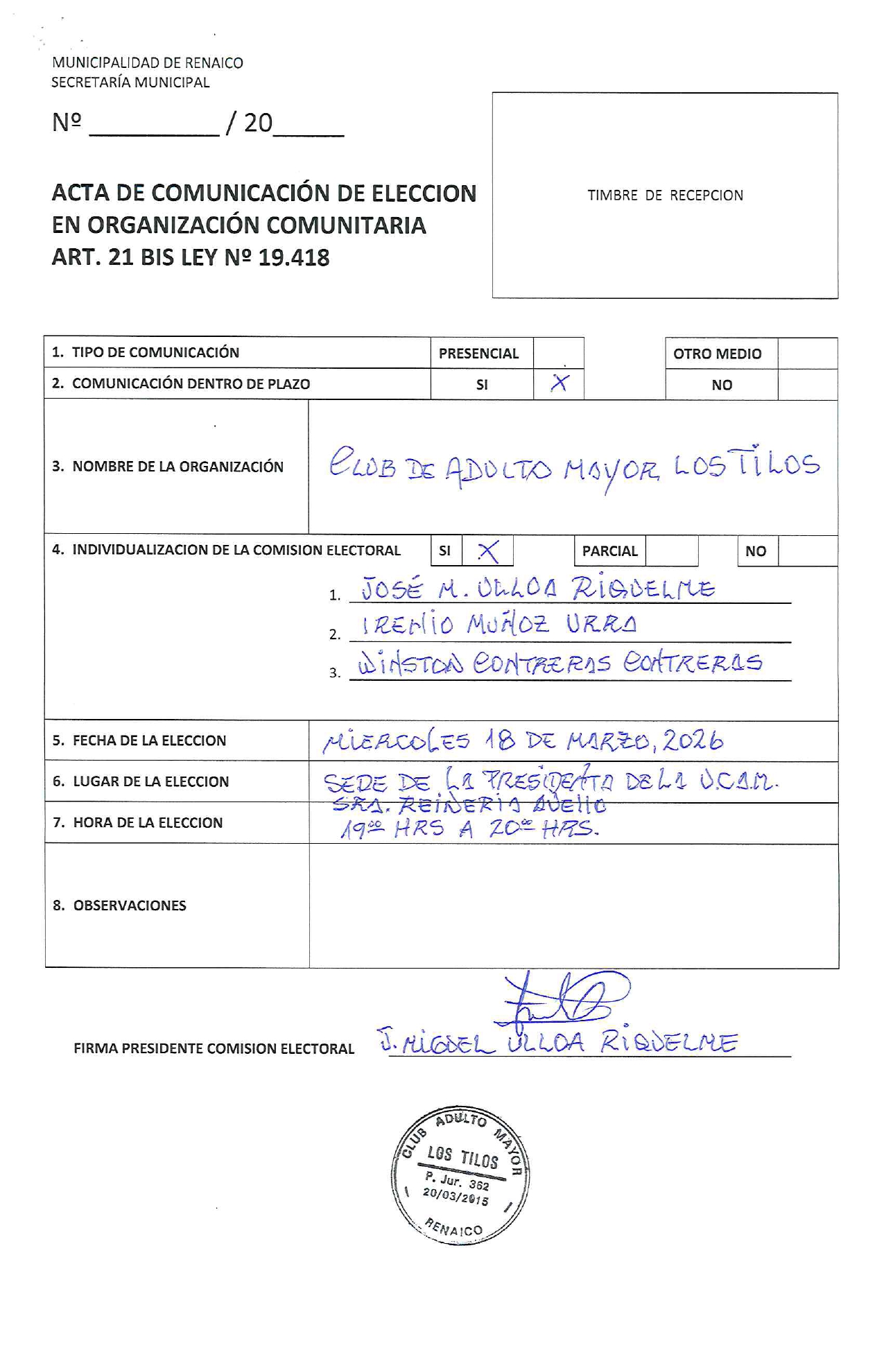 ACTA DE COMUNICACIÓN DE ELECCION EN ORGANIZACIÓN COMUNITARIA «CLUB DE ADULTO MAYOR LOS TILOS»