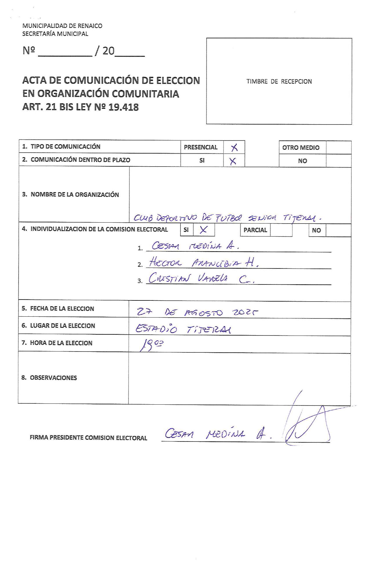 Acta Organización Comunitaria 24 de septiembre de 2025 ACTA DE COMUNICACIÓN DE ELECCION EN ORGANIZACIÓN COMUNITARIA «Club deportivo de futbol senior Tijeral»