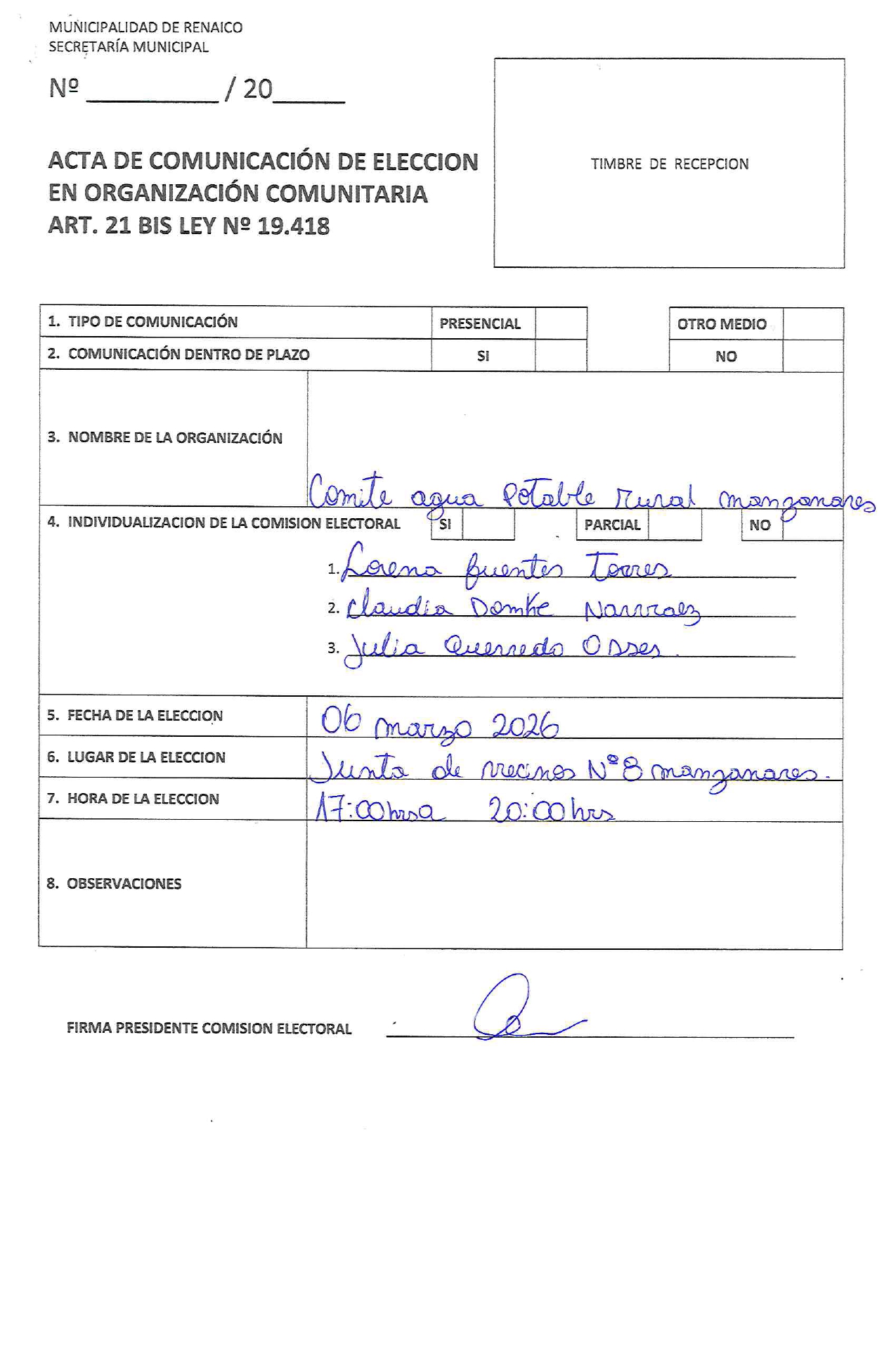 Acta Organización Comunitaria 16 de abril de 2026 ACTA DE COMUNICACIÓN DE ELECCION EN ORGANIZACIÓN COMUNITARIA «COMITE AGUA POTABLE RURAL MANZANARES»
