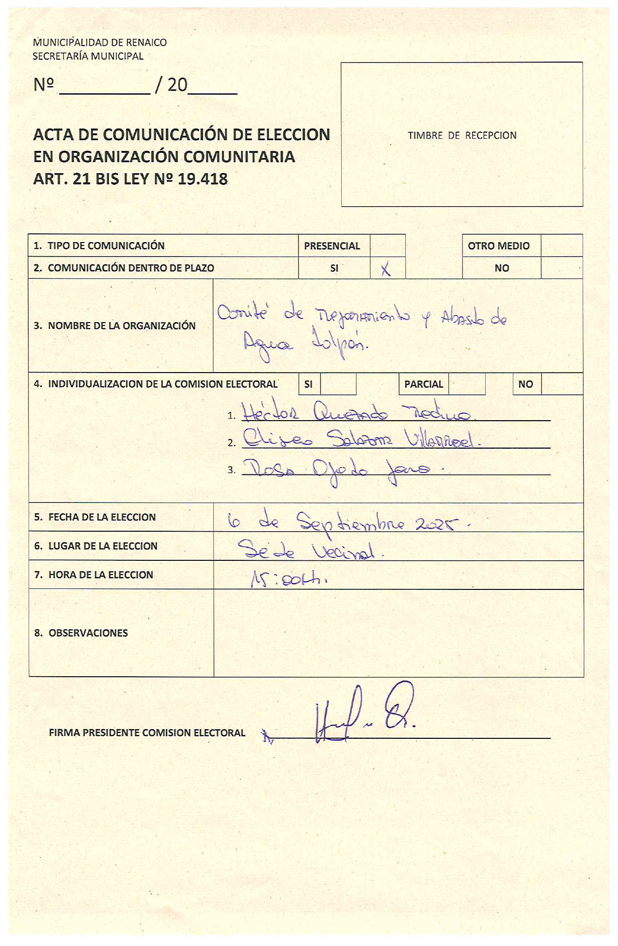 Acta Organización Comunitaria 22 de septiembre de 2025 ACTA DE COMUNICACIÓN DE ELECCION EN ORGANIZACIÓN COMUNITARIA «Comité de mejoramiento y abasto de agua Tolpán» Compartir FacebookTwitterWhatsAppLinkedinEmailImpresiónTelegram